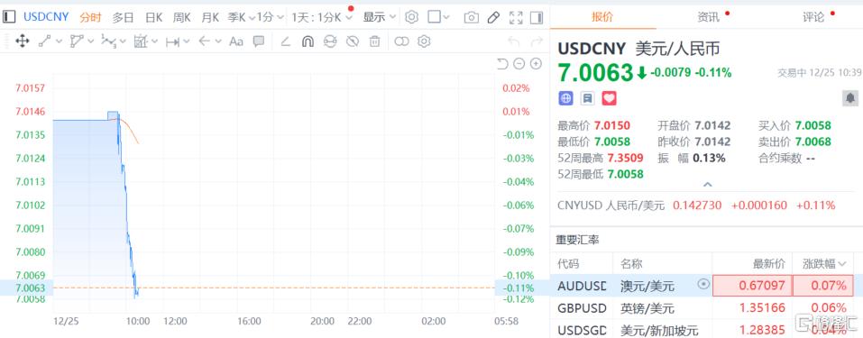 今日(12月25日),离岸人民币兑美元升破7.0大关,最高触及6.99709,续创2024年9月30日以来新高;在岸人民币兑美元升破7.01关口,一度升至7.0058,突破了2024年9月27日的前高(7.0106),创2023年5月22日以来新高。