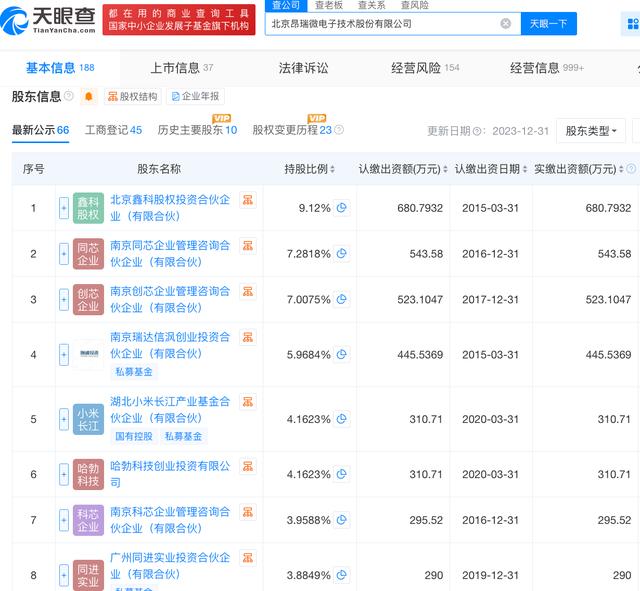 天眼查App信息显示,昂瑞微成立于2012年7月,前身为北京中科汉天下电子技术有限公司(即“北京汉天下”)。目前,该公司的注册资本为7464.8766万元,法定代表人为钱永学,主要股东包括北京鑫科股权投资合伙企业(有限合伙)(下称“北京鑫科”)等。