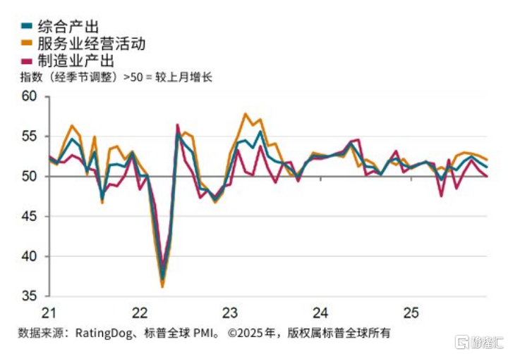 中国11月RatingDog服务业PMI录得52.1,虽较前值52.6小幅回落,仍高于51.9的预期,延续扩张态势但增速放缓。分项来看,新订单指数持续增长、新出口订单因营销加大及贸易不确定性缓解而改善;但业务活动预期降至4月以来低点,就业仍处收缩区间。投入品价格连续9个月上涨,销售价格重回扩张,企业利润空间持续承压。