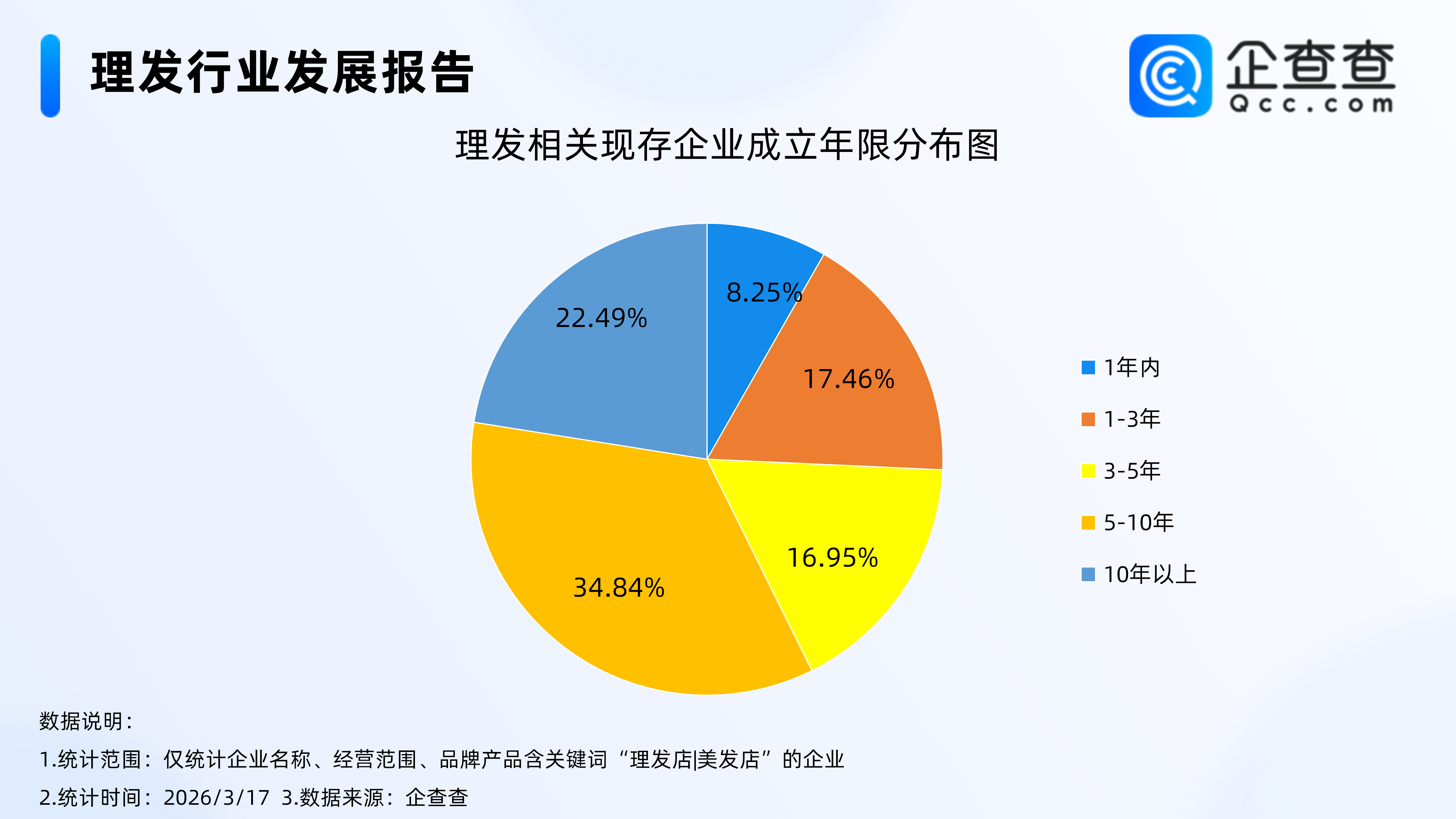 企查查数据显示,理发行业整体经营稳定性较强,老牌企业占主导。成立年限方面,现存理发相关企业中,成立年限在5年以上的企业占比近6成,其中,成立年限在5-10年的相关企业最多,占比达34.84%。成立10年以上的相关企业占比22.49%。
