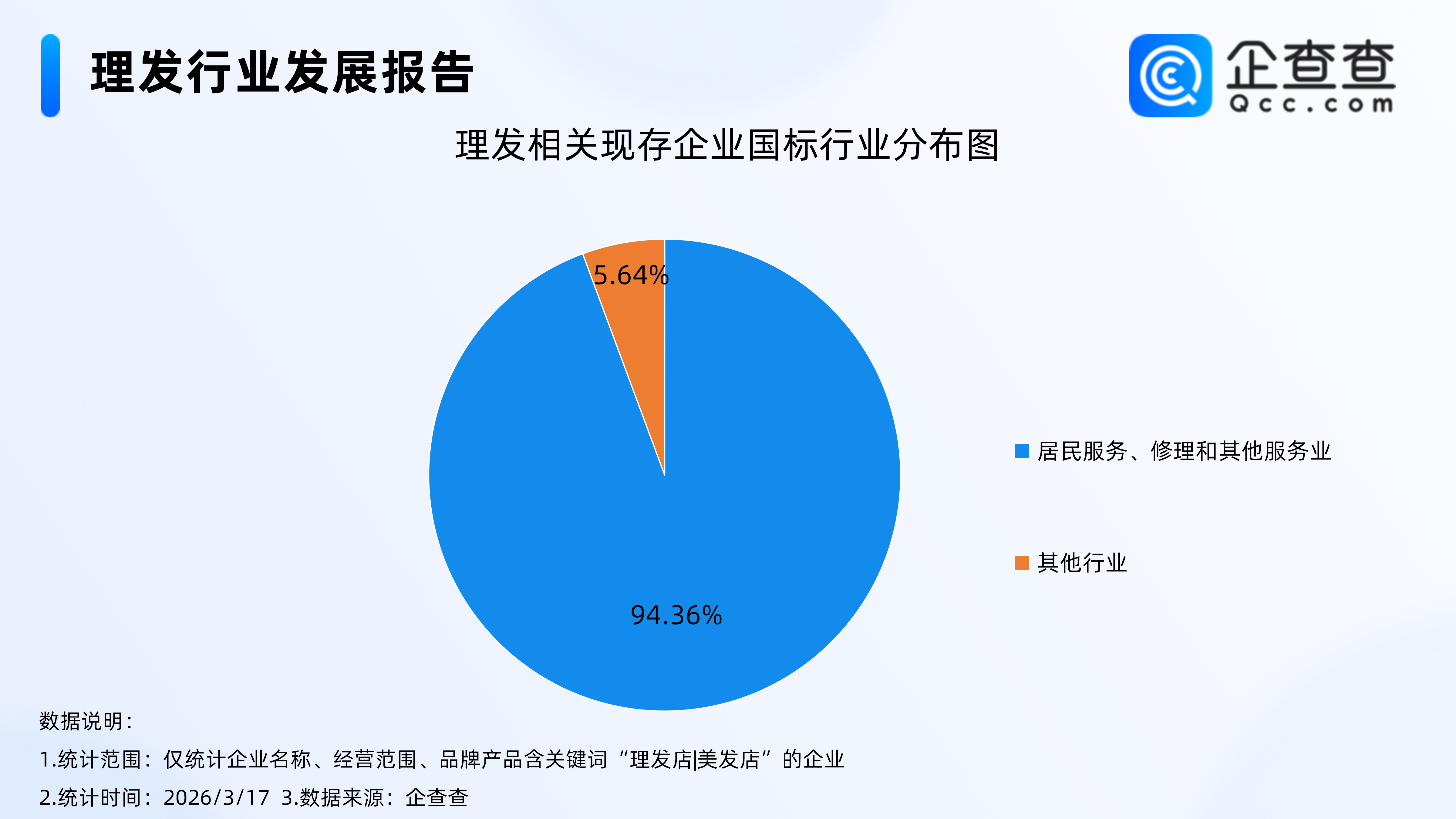 企查查数据显示,理发相关企业行业归属高度集中,民生服务属性突出。国标行业分类中,94.36%的相关企业属于居民服务、修理和其他服务业,与大众日常生活紧密绑定,是典型的民生刚需型服务行业。