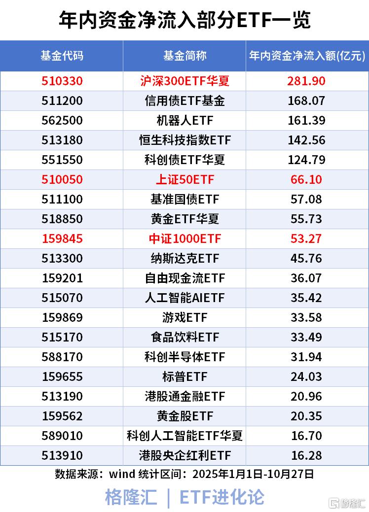 比如,沪深300ETF华夏、上证50ETF、中证1000ETF年内资金净流入分别为281.90亿元、66.10亿元、53.27亿元。