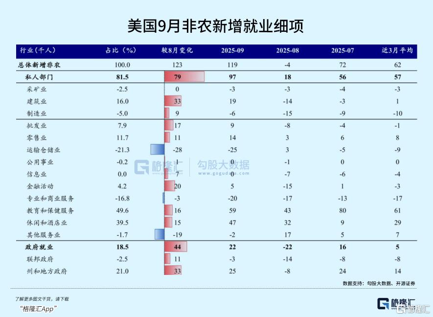 8月正值美国政府停摆,联邦统计机构员工休假导致数据搜集延迟,约1.2万家企业的用工数据未能纳入统计,这些数据在9月集中补报,直接推动9月机构调查新增岗位增加约3.8 万个。