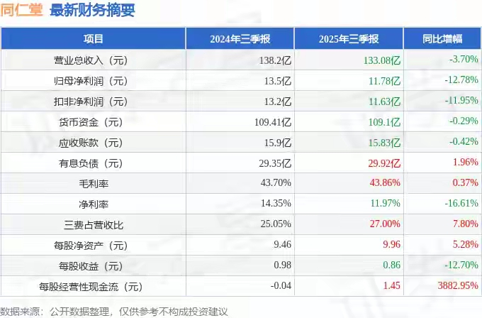 透过磷虾油事件的表象,我们拉长也更能看到同仁堂品牌本身在经营增长上的承压。近期同仁堂发布2025年三季报。根据证券之星报道以及相关财报,同仁堂净利润同比下降12.78%。截至本报告期末,公司营业总收入133.08亿元,同比下降3.7%,归母净利润11.78亿元,同比下降12.78%。