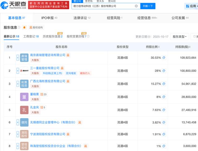 天眼查App信息显示,德力佳成立于2017年1月,前身为北京德力佳传动科技有限公司。而在2018年8月,德力佳则迁移至江苏省无锡市,并更名为德力佳传动科技(江苏)有限公司。