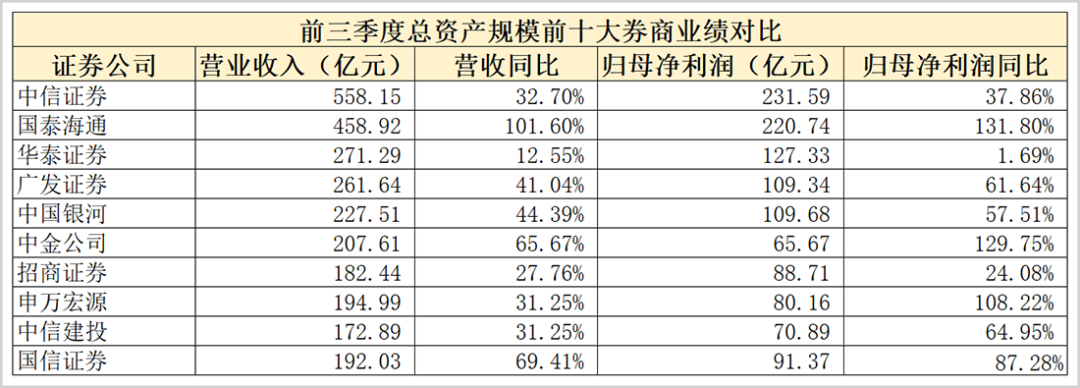 以经纪业务为例,前三季度中信证券和国泰海通分别实现业务收入109.39亿和108.14亿,同比增长了52.90%及142.80%,是全部上市券商中仅有的两家收入超百亿的公司,显著高于第三名广发证券的近70亿收入。而且国泰海通在总资产前十大券商中增长最快。