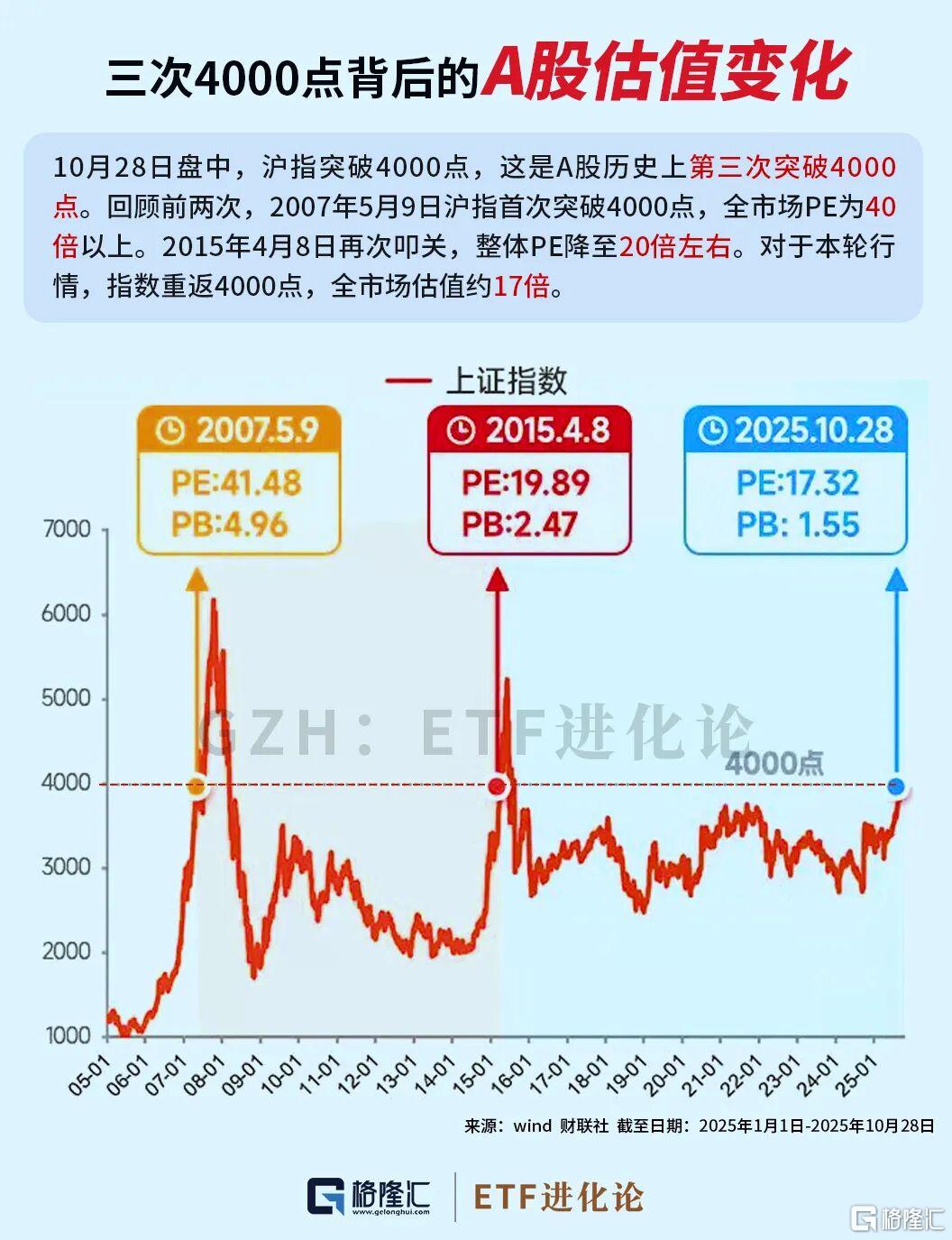 从最新估值来看,历史上沪指三次站上4000点,估值逐步降低。2007年5月9日沪指首次突破4000点,全市场PE超过40倍;2015年4月8日再次站上,整体PE降至20倍左右;2025年10月28日,沪指盘中重返4000点,全市场估值约为17倍。