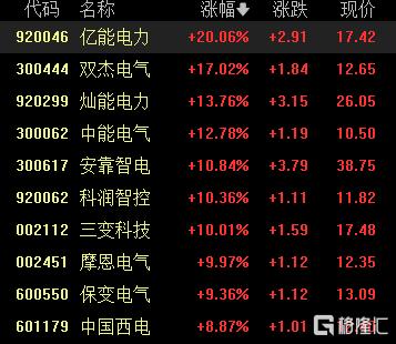 电网设备股走强,亿能电力涨超20%,双杰电气涨超17%,灿能电力涨超13%,电能电气涨超12%,安靠智电、科润智控等跟涨。