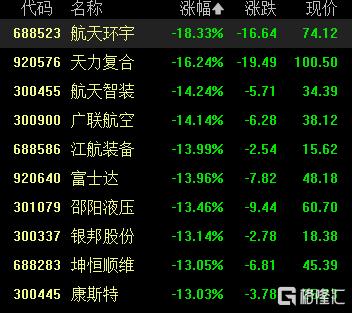 商业航天股大面积跌停,航天环宇跌超18%,天力复合跌超16%,航天智装、广联航空跌超14%,江航装备、富士达跌超13%,长江通信、中国卫通、航天发展、北斗星通、中天火箭等10CM跌停。
