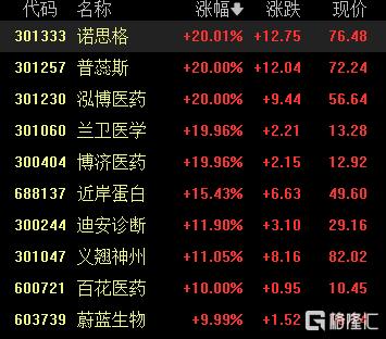 CRO概念大涨,诺思格、普蕊斯、泓博医疗、兰卫医学、博济医药20cm涨停,近岸蛋白涨超15%。
