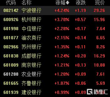 银行股普涨,宁波银行涨超4%,杭州银行涨超3%,中信银行、渝农商行涨超2%,苏州银行、成都银行等跟涨。