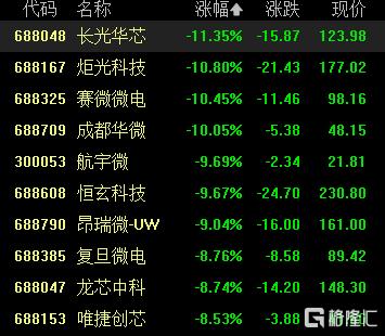 半导体股走低,长光华芯跌超11%,炬光科技、赛微微电、成都华微跌超10%,航宇微、恒玄科技跌超9%。