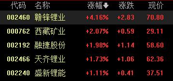 锂矿股表现活跃,赣锋锂业涨超4%,西藏矿业涨超2%,融捷股份、天齐锂业、盛新锂能等跟涨。