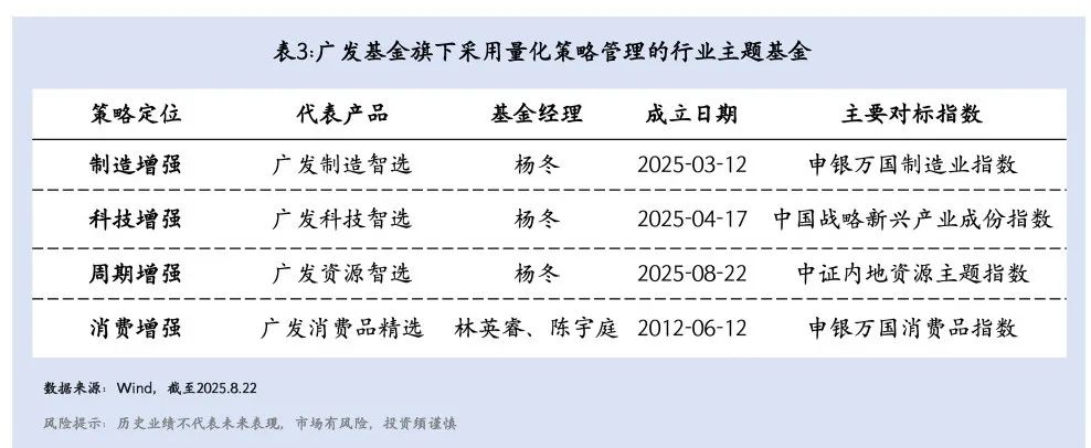 对于偏好行业主题增强的投资者,广发基金也在今年新布局了“智选”系列,包括广发制造智选(023524)、广发科技智选(023647)以及广发资源智选(023834)三只基金,均采用“主观+主动量化+AI增强”的策略。