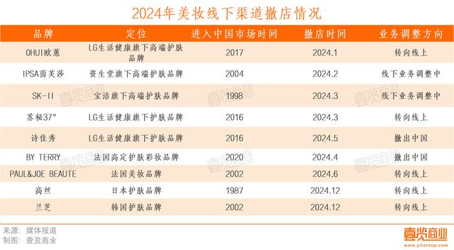 从上表看,选择撤柜的美妆品牌以日韩系居多。不乏SK-II、高丝等最早一批进入中国市场的老品牌。其中,诗佳秀、BY TERRY两个美妆品牌已宣布彻底退出中国市场、SK-II、IPSA茵芙莎仍有线下门店,并继续推进线下渠道的推进与调整。苏秘37°、OHUI欧蕙、高丝、兰芝都将业务转向线上。