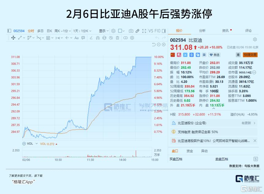 A股比亚迪午后强势拉升涨停,收报311.08元,重新站上300元关口,创3个多月新高;港股比亚迪股份也大涨超10%。