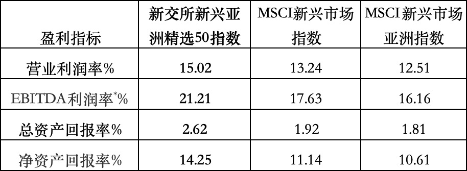 新兴亚洲ETF标的指数为新交所新兴亚洲精选50指数,截至2024年三季度报数据,对比MSCI新兴市场指数、MSCI新兴市场亚洲指数,该指数各项财务数据相对更佳。