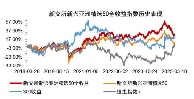 截至2025年3月28日,新交所新兴亚洲精选50全收益指数自基日(2018年3月28日)以来回报率为29.21%,价格指数涨幅9.84%,优于同期MSCI新兴市场指数(-4.54%)。