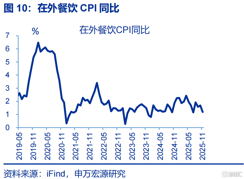 服务CPI中,出行需求走弱拖累核心服务CPI,同时房租CPI有进一步下滑。11月,服务CPI同比回落0.1pct至0.7%。拆分结构看,目前青年就业压力增加下,租房需求较弱令11月房租CPI同比继续回落(-0.1pct至-0.2%)。核心服务CPI整体(环比-0.5%)也弱于季节性,主因节后出行需求回落,宾馆住宿、飞机票价格均有回落;同时统计在食品烟酒中的在外餐饮CPI也有下滑(同比-0.5pct至1.2%)。