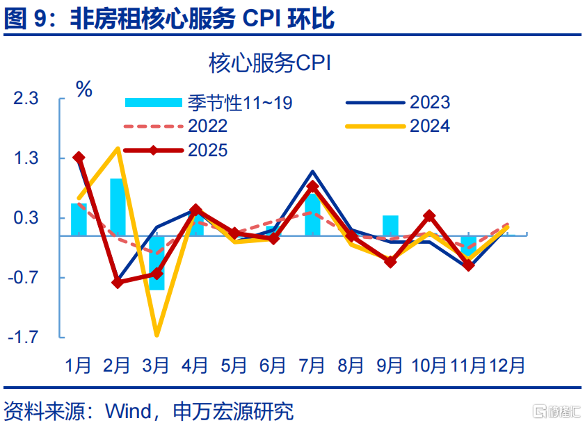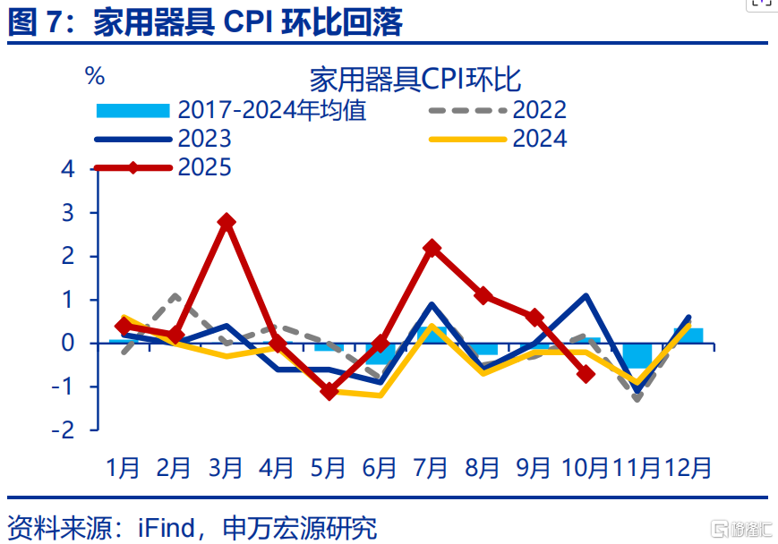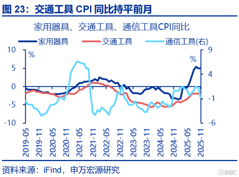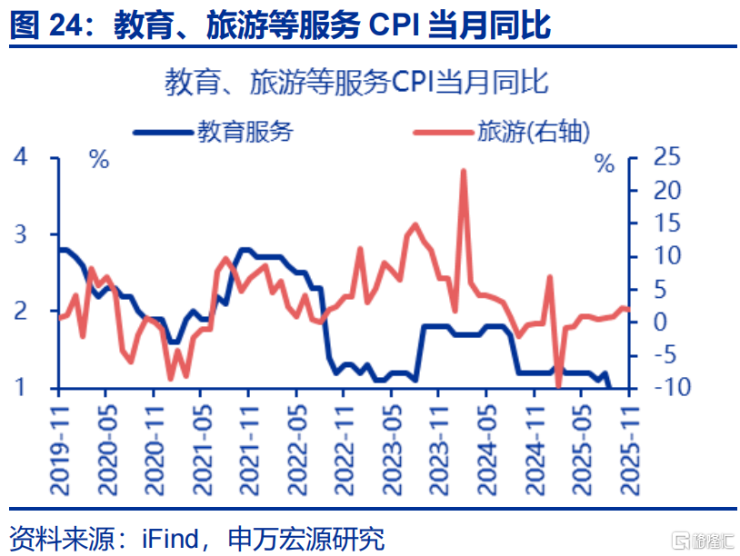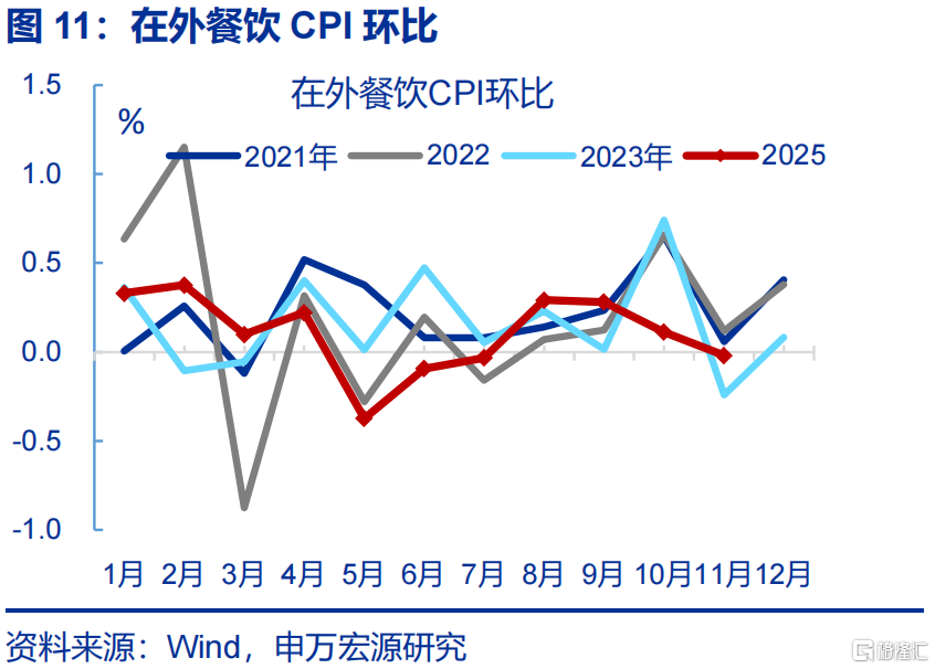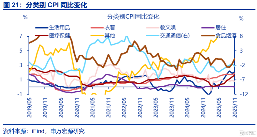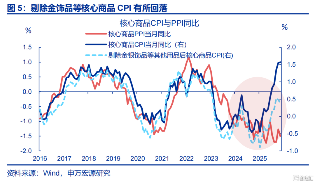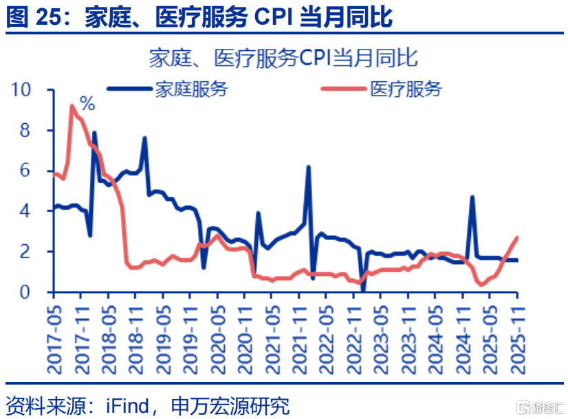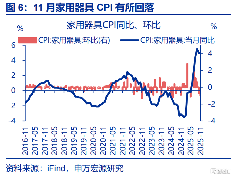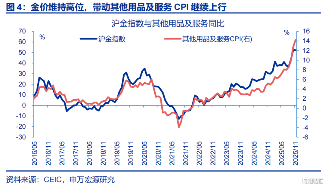 金价高位也对核心商品CPI有较大支撑;而剔除金价影响后,核心商品CPI出现回落。11月,核心商品CPI同比持平于1.6%,更多来自金价高位的支撑。11月金价同比维持在52.2%的较高水平,带动国内金饰品价格同比涨幅扩大至58.4%。但剔除金饰品后的其余核心商品CPI同比未继续上涨、反而回落0.1pct至0.4%。主因或是国补退坡下,“以旧换新”等相关商品的需求有所走弱。
