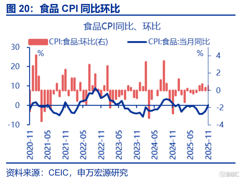 11月CPI同比走强,源于低基数与部分细项供给减少推升食品CPI,受反内卷影响较大的猪肉价格仍在低位。11月CPI同比较前月上行0.5pct至0.7%。结构上食品环比0.5%、明显好于季节性(-0.5%),低基数下同比上行3.1pct至0.2%。其中鲜菜、鲜果CPI同比分别上行21.8、2.7pct至14.5%、0.7%;且供给减少下,鲜菜CPI好于往年同期。相比之下,受反内卷影响较大的猪肉价格仍维持低位,猪肉CPI同比为-15%。