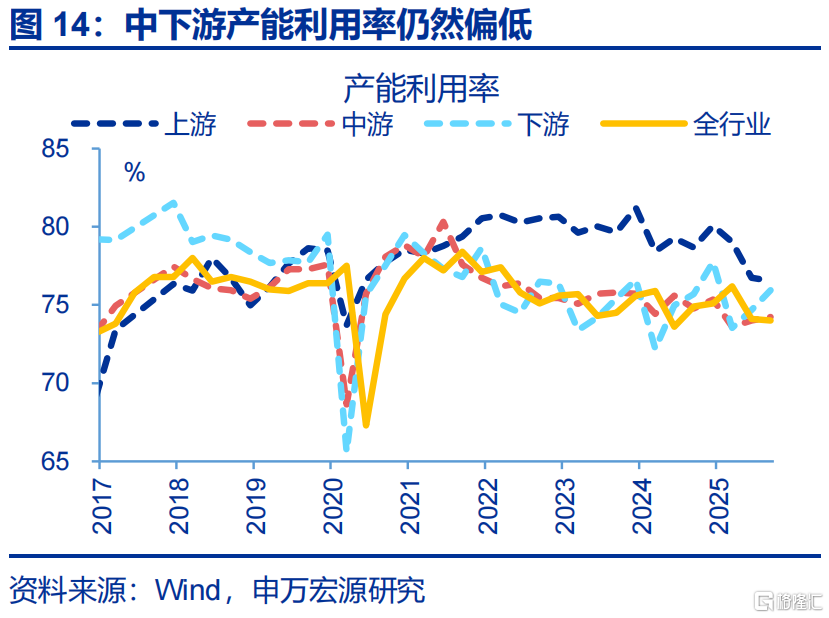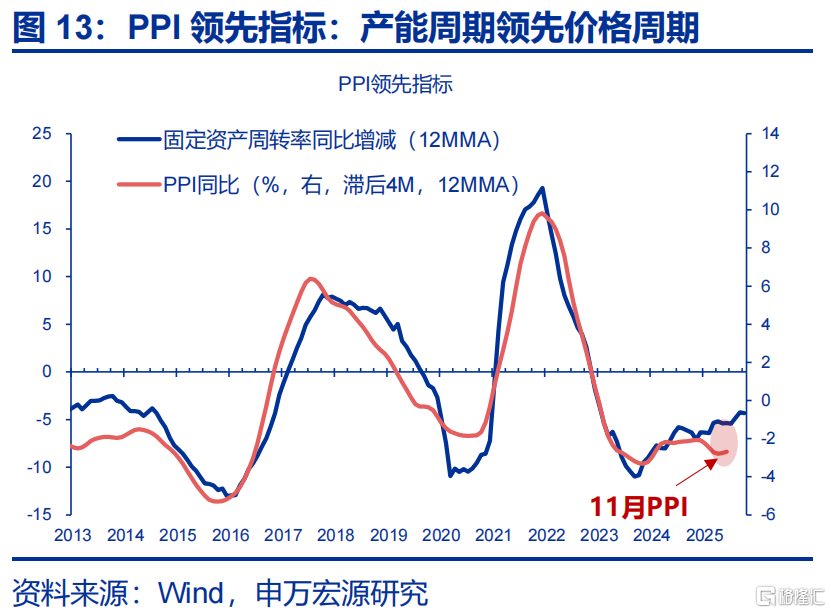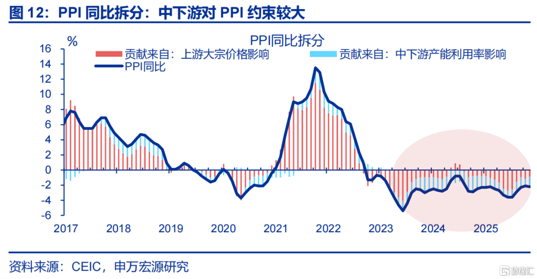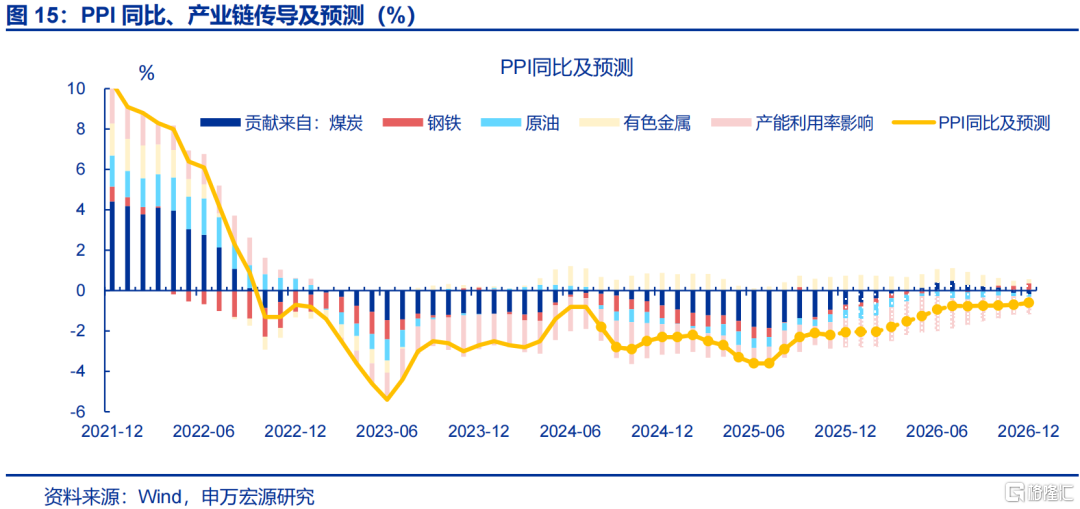 PPI方面,11月反内卷推动煤价继续上涨,但中下游PPI偏弱,也对总体PPI和核心CPI形成压制。11月PPI环比0.1%。从影响因素看,11月以来,反内卷推动煤价延续上涨(环比9.5%),煤炭采选、煤炭加工业价格环比分别4.1%、3.4%,拉动PPI环比0.3%,为主要贡献项。铜价受供给收紧影响也有回升,相应有色采选、有色压延业价格环比分别2.6%、2.1%,拉动PPI环比0.2%。而钢价、油价回落,拖累PPI环比-0.2%。同时,中下游产能利用率也未明显改善,导致中下游价格无法充分反映上游涨价传导,测算该因素拖累PPI环比-0.2%,也压制核心商品CPI。其中,医药、汽车、酒和饮料等PPI环比分别-0.4%、-0.1%、-0.1%。