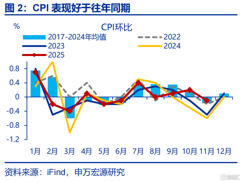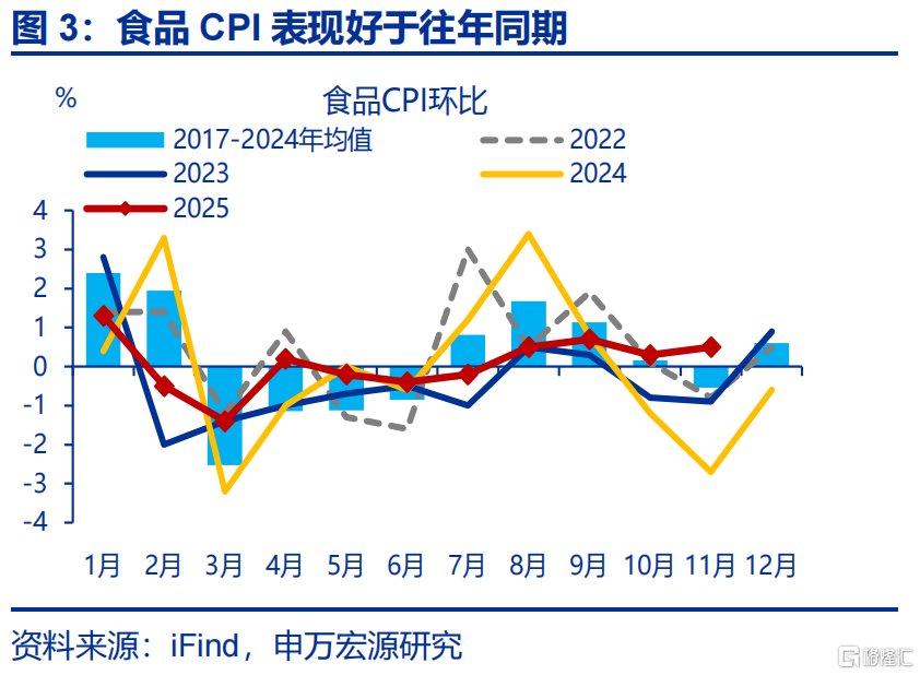 11月CPI同比走强,源于低基数与部分细项供给减少推升食品CPI,受反内卷影响较大的猪肉价格仍在低位。11月CPI环比-0.1%,略高于2017年以来的均值(-0.2%);CPI同比较前月上行0.5pct至0.7%。结构上食品环比0.5%、明显好于季节性(-0.5%),低基数下,同比上行3.1pct至0.2%。其中鲜菜、鲜果CPI同比分别上行21.8、2.7pct至14.5%、0.7%;且供给减少下,鲜菜CPI好于往年同期。相比之下,受反内卷影响较大的猪肉价格仍维持低位,猪肉CPI同比为-15%。