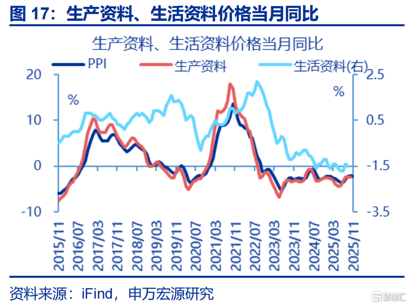 PPI同比回落,其中生活资料回落较大。11月,PPI同比录得-2.2%,与前月相比回落0.1pct。结构上,生活资料同比较前月回落0.1pct至-1.5%,而生产资料同比为-2.4%,持平上月。