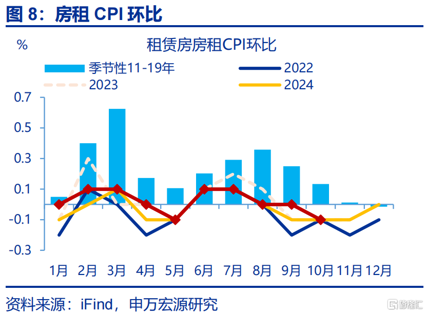 服务CPI方面,整体服务CPI下行,核心服务CPI、房租CPI均有回落。11月,整体服务CPI同比边际下行0.1pct至0.7%。具体分项看核心服务CPI环比-0.5%、弱于季节性。同时11月房租CPI环比-0.2%、不及往年同期(0.01%)。