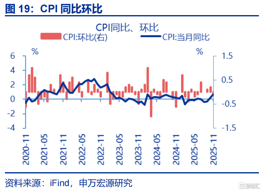展望后续:大宗商品价格有进一步上行的可能,但反内卷对中下游价格的影响或偏慢,预计通胀回升幅度相对温和。煤、铜等大宗商品在供给收缩的影响下,价格或延续上涨,预计大宗价格对PPI贡献可能仍在持续,但反内卷对中下游价格的影响需要一定时间,预计PPI同比在12月稳定在-2.1%,2026年逐季修复、但修复斜率可能慢于市场预期。CPI方面,低基数及黄金价格高位对12月CPI的拉动或仍在,但国补力度退坡及中下游PPI回升偏慢的约束下,年内CPI同比或稳定在0.6%。明年反内卷推动PPI与猪价回升,有望对CPI修复形成支撑。但黄金价格涨幅放缓、国补退坡等问题或约束CPI反弹幅度,CPI同比或温和回升。
