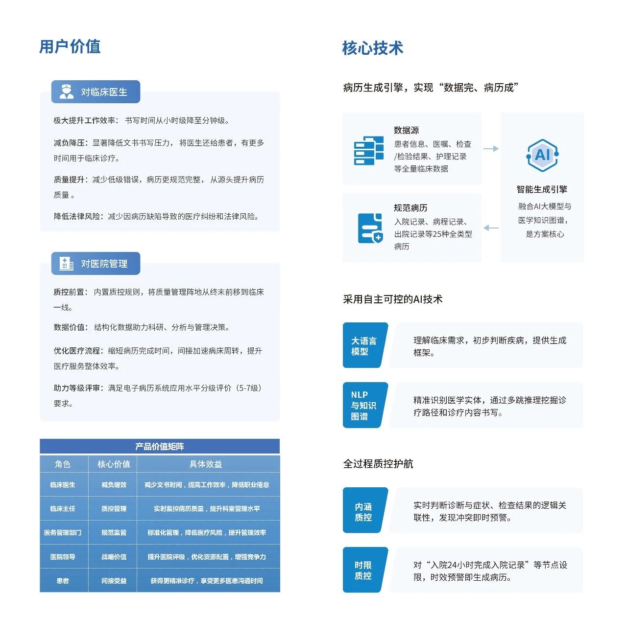 该产品以公司不断训练优化医疗大模型及医学模型、持续医疗知识图谱更新、医疗文书结构化应用、全面的临床场景逻辑链条接通等为支撑,可辅助或自动化辅助医疗行业客户完成日常病历文书的编写,自动生成如入院记录、病程记录、出院小结等结构化住院病历文书,进一步提升病历书写效率、规范病历格式,强化住院病历质量把控过程,将医生从繁重、重复的文书工作中适度释放,使其将更多的时间投入到临床诊疗核心工作。