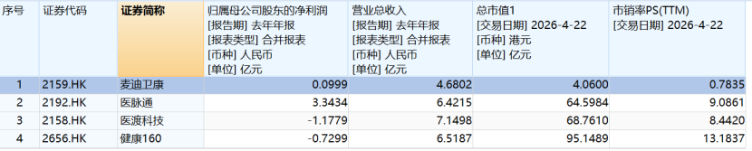根据WIND数据显示,截至4月22日收盘,麦迪卫康当前总市值约4.1亿港元,甚至低于其2025年4.68亿元人民币的全年营收,市销率(PS)不到1倍。而一家刚刚扭亏、AI业务占比近半、且手握顶级医院网络和前沿AI模型的公司,却被市场按照“传统服务商”来定价。
