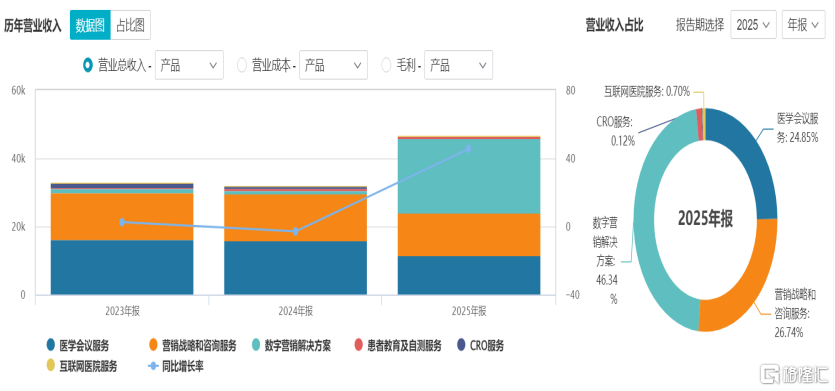 拆解收入构成可以发现,公司数字营销解决方案服务收入从2024年的仅1010万元飙升至2.17亿元,占比从3.1%跃升至46.4%,取代传统医学会议服务成为第一大收入来源。这意味着,麦迪卫康已不再是一家单纯靠“办会”赚钱的传统服务商:AI驱动的数字化业务正在成为新的增长引擎,公司向“医疗专业服务+前沿AI数字科技”双轮驱动的战略转型。