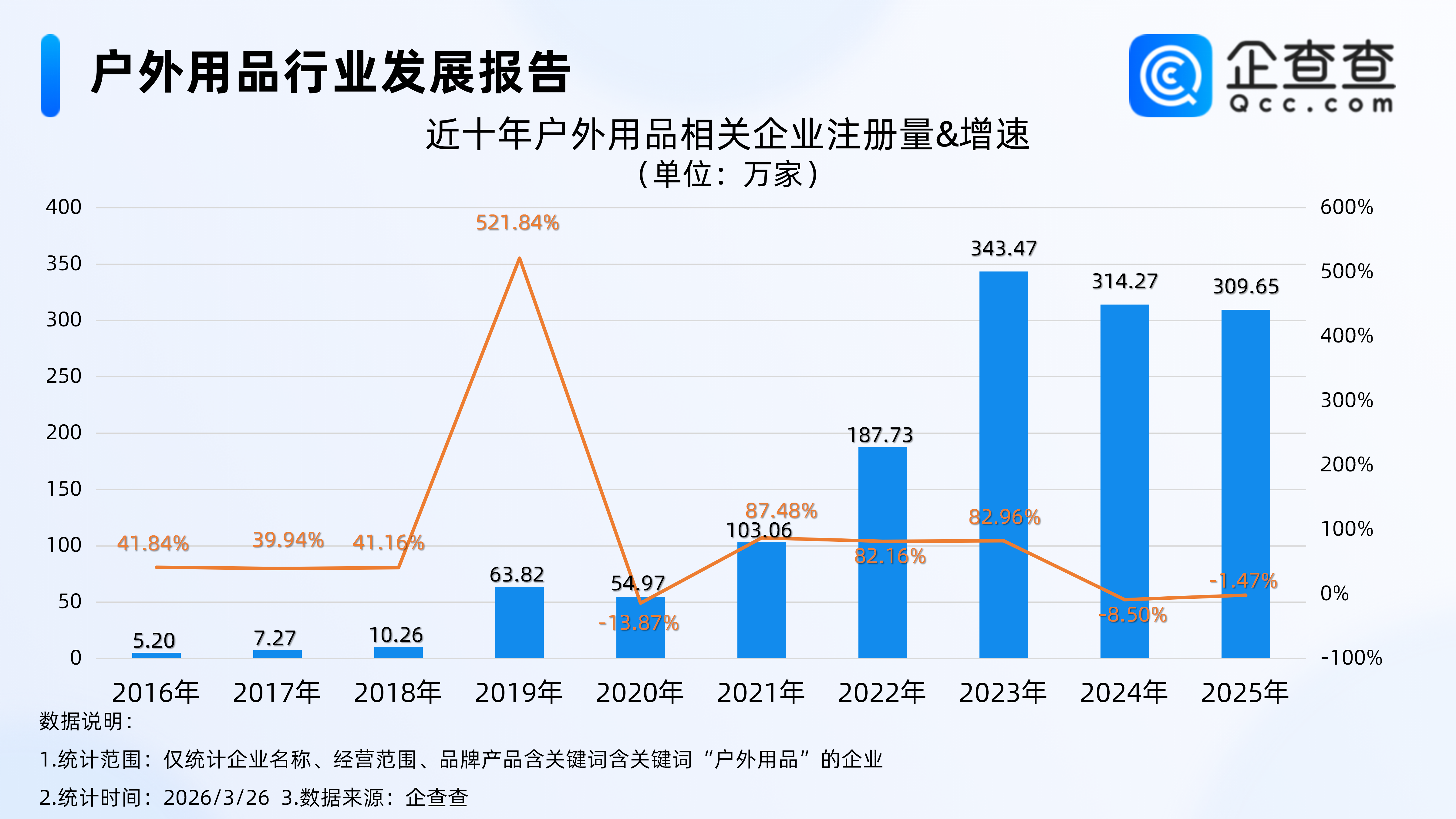企查查数据显示,从近十年户外用品相关企业注册量及增速数据来看,行业注册量整体呈现出波动上升的趋势,尤其是2023年以来,企业注册量连续三年突破300万家,行业扩张速度显著加快。截至3月25日,今年国内已注册户外用品相关企业49.17万家,延续了行业的注册热度。
