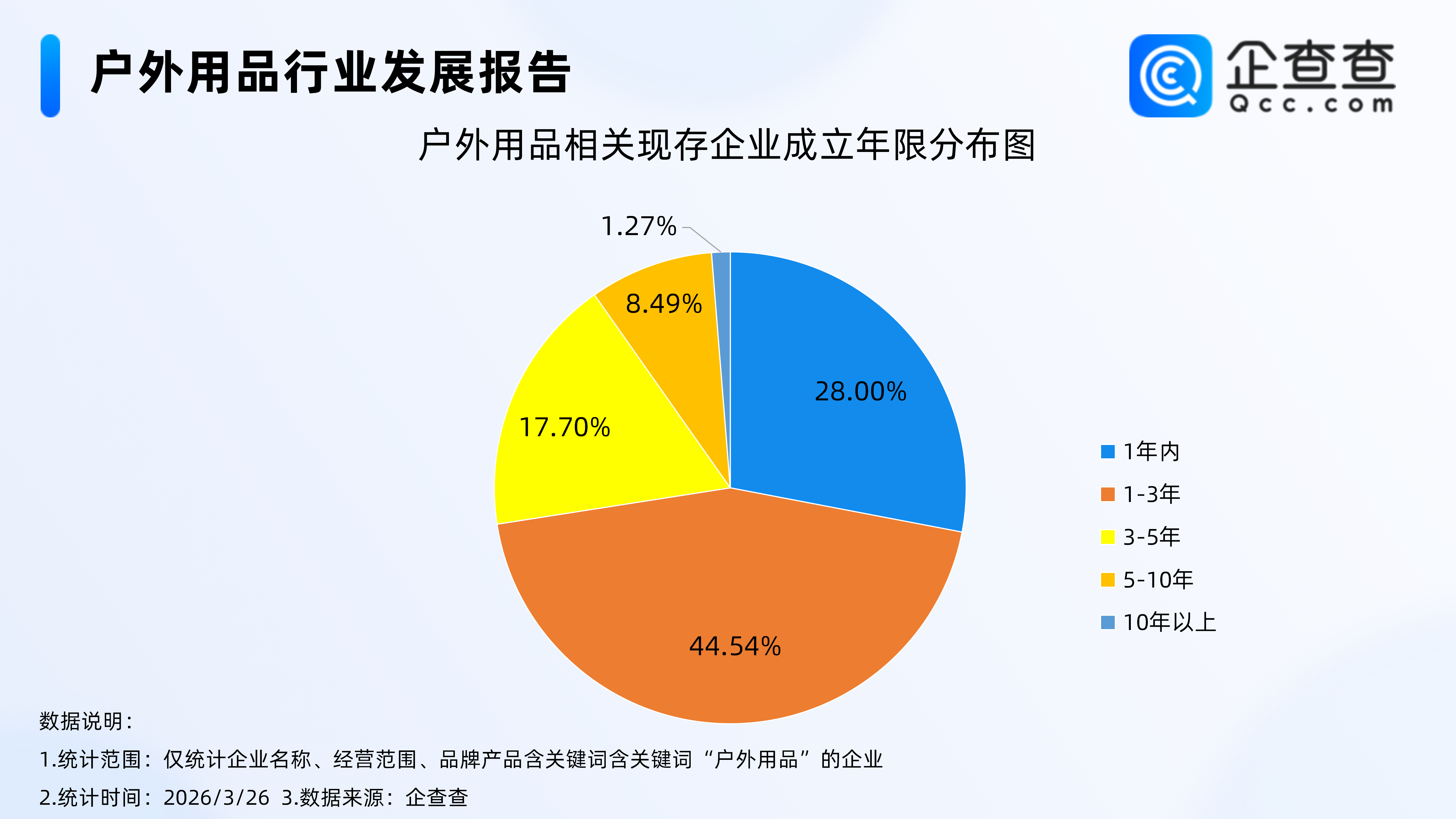 企查查数据显示,从成立年限分布来看,户外用品相关现存企业整体呈现出年轻化特征,超七成企业成立于三年内,市场新鲜血液持续注入,行业发展活力十足。具体来看,成立年限在1-3年的企业数量最多,占比达44.54%;成立1年内的企业占比28.00%,新晋入局者数量可观;上述两类企业合计占比72.54%,印证了户外用品行业近年来的火爆发展态势。