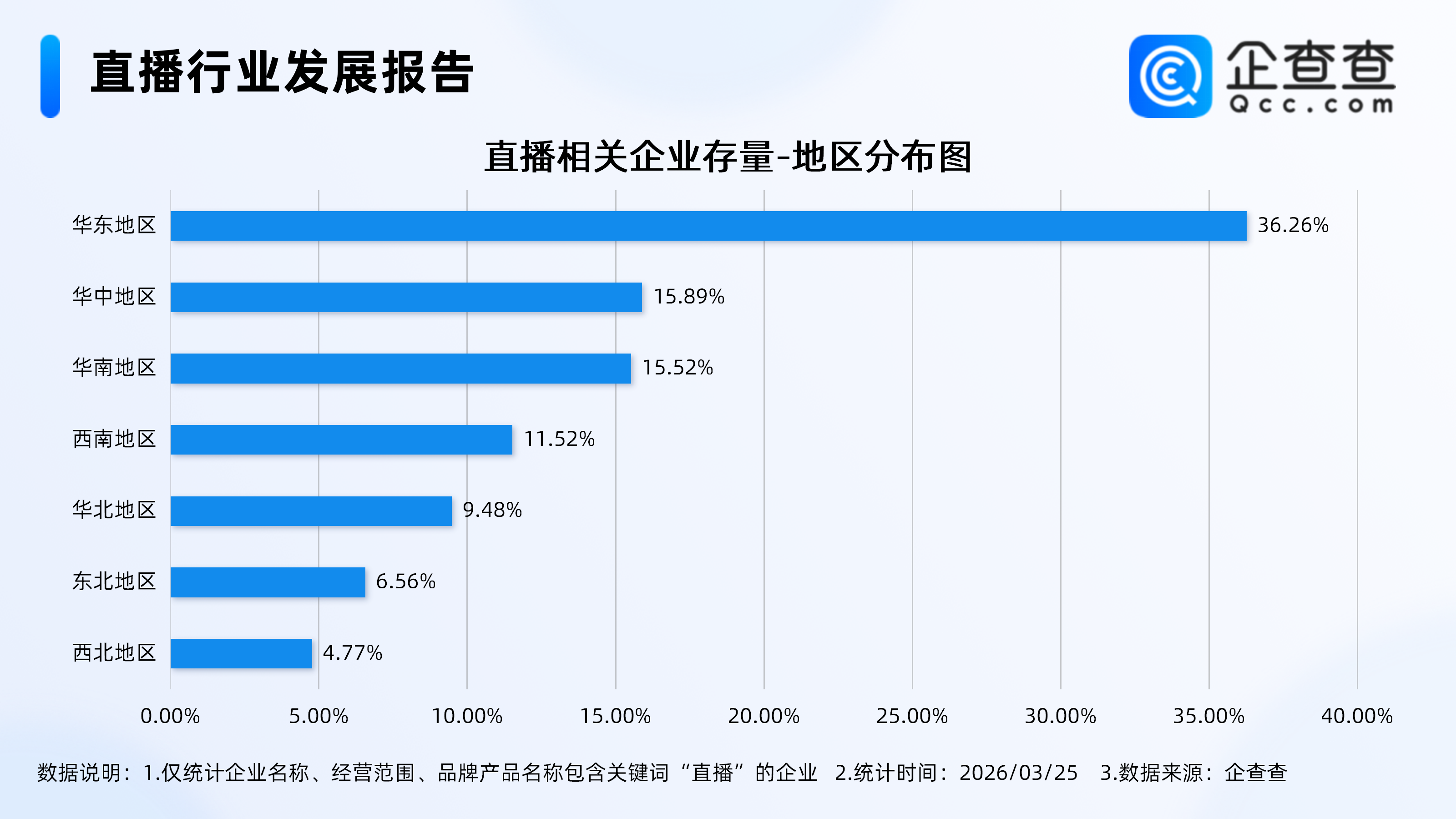 企查查数据显示,地区分布上,直播相关企业区域集聚效应明显。华东地区以36.26%的占比位居首位,华中、华南地区分别以15.89%、15.52%紧随其后,三大区域合计占比超67%,形成了以东部沿海为核心、向中西部辐射的产业布局,反映出经济发达地区在直播业态孵化、供应链配套、消费市场方面的优势。