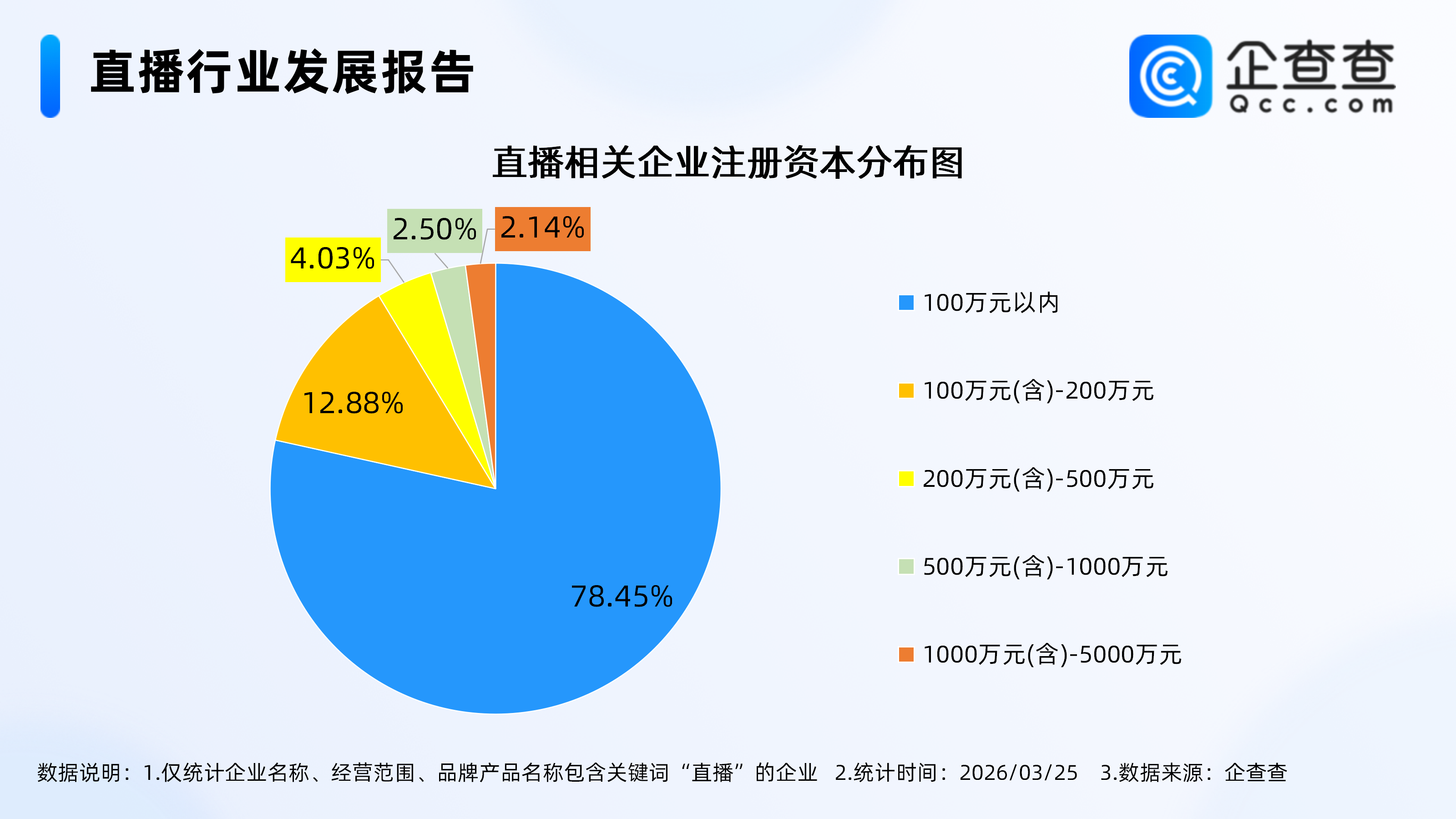 企查查数据显示,从注册资本分布看,轻资产创业特征显著。78.45%的企业注册资本在100万元以内,12.88%的企业注册资本在100万元(含)-200万元区间,合计超九成企业注册资本低于200万元,体现出直播行业创业门槛低、市场活力强的特点,为中小微企业提供了广阔发展空间。