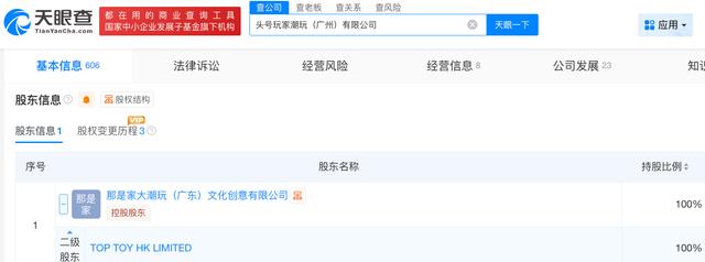 天眼查App新显示,TOP TOY的主要经营实体为头号玩家潮玩(广州)有限公司,成立于2020年11月。目前,该公司的注册资本为5000万元,法定代表人为孙元文,全资股东为那是家大潮玩(广东)文化创意有限公司,由TOP TOY HK LIMITED控制。