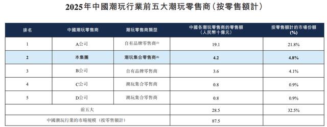 2025年,TOP TOY于中国内地实现GMV人民币42亿元。根据弗若斯特沙利文报告,按GMV计,2025年中国潮玩行业的市场规模达人民币875亿元。其中,TOP TOY的市场份额为4.8%,而第一名为21.8%,第三名为4.1%。