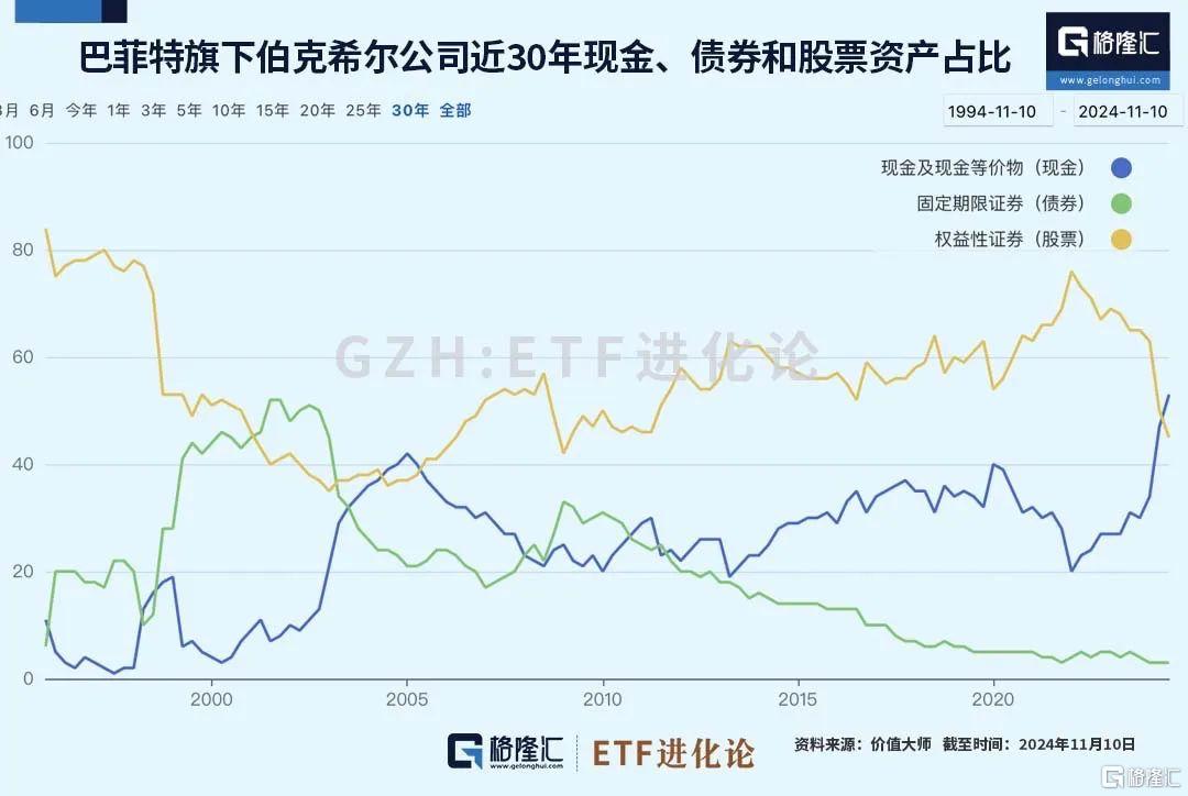 最新数据显示,伯克希尔的流动资产中有约45%的股票,53%的现金及现金等价物,以及3%的债券。