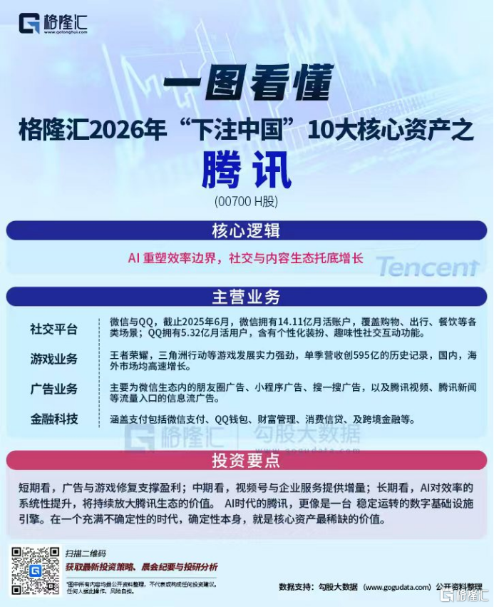 2026年度格隆汇“下注中国”十大核心资产已正式发布,腾讯控股(00700.HK)历经多轮筛选与角逐,成为数字经济领域的核心标的。