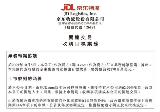 公司情报专家《财经涂鸦》获悉,10月8日,京东物流发布公告称,已与JD.com(京东集团)订立业务转让协议。