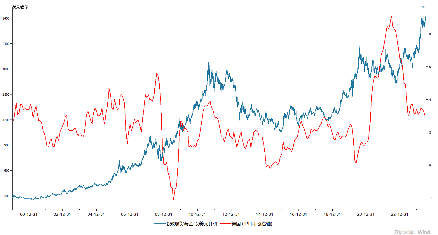 图5:美国CPI和以美元计价黄金价格走势