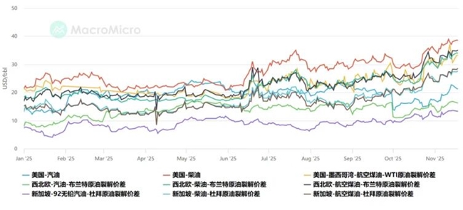 2025年下半年,海外成品油裂解价差大幅抬升,其中欧洲、新加坡汽油裂解价差创5年同期新高。究其原因,一方面是乌克兰无人机袭击致俄罗斯炼厂,俄原油加工量与柴油出口量持续回落。另一方面,美国受电力紧张与秋季炼厂检修影响,10 月炼厂关停 133.7 万桶/日,开工率下滑。与此同时,欧洲炼厂的不断退出导致的海外炼能偏紧,多重因素推动全球汽柴油裂差冲高。11月,欧洲/新加坡/美国汽油价差最高达27/17/25美元/桶,较年初分别上涨286%、125%、92%,柴油价差最高41/33/48 美元/ 桶,较年初分别上涨174%、93%、110%。