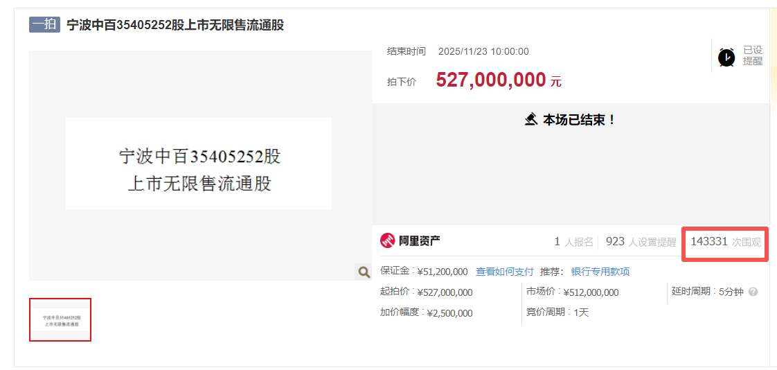 11月23日上午10时,阿里资产拍卖平台显示,宁波中百3540.53万股上市无限售流通股的拍卖正式结束。