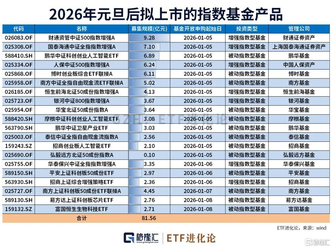 Wind数据显示,元旦后预备上市的指数基金共有20只,合计规模为81.56亿元。