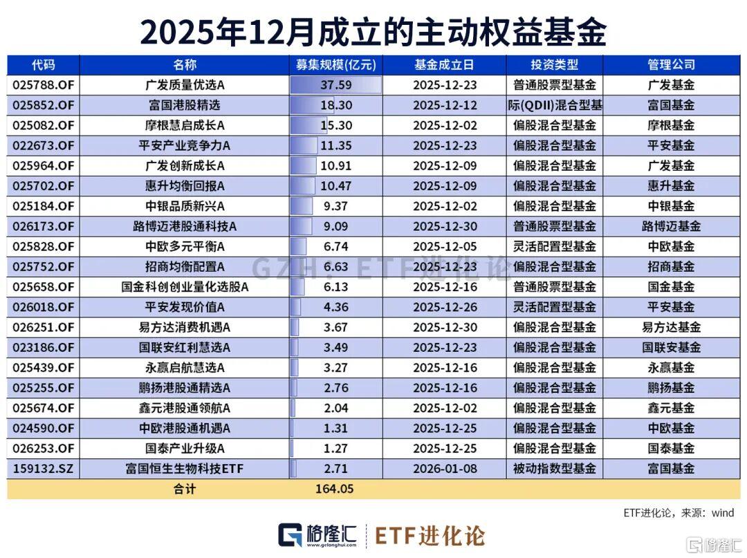 其中在2025年12月成立的主动权益基金共有19只,合计募集规模为164亿元。