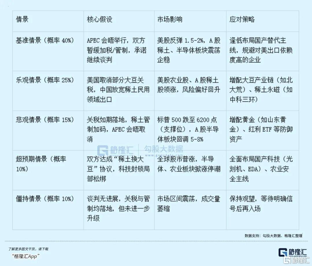 本文通过5种情景推演后续走向,锁定APEC会晤、稀土管制执行等4个关键观察节点,拆解市场短中长期市场机会,期待能帮大家在市场动荡调整中把握“攻守易势”的再次上车布局机会。