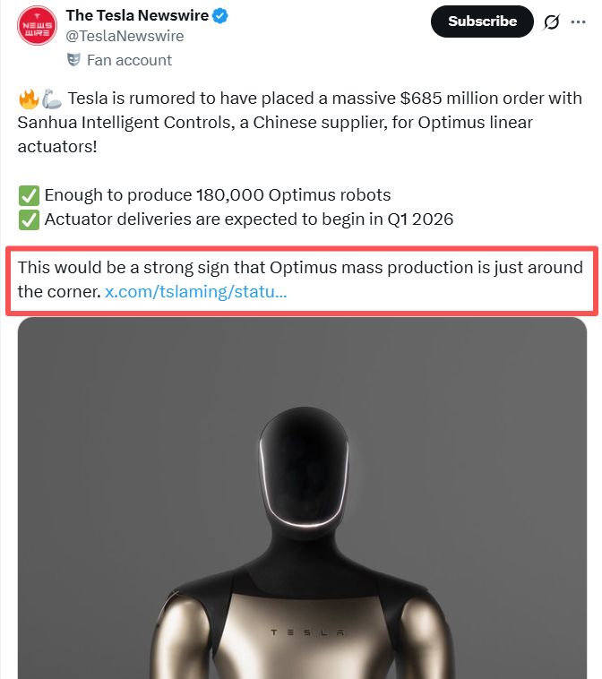 帖子中还写道:“行业估算显示,该订单量足以生产至少18万台Optimus机器人,强烈表明特斯拉对人形机器人量产及商业部署的紧迫承诺与高度信心。”