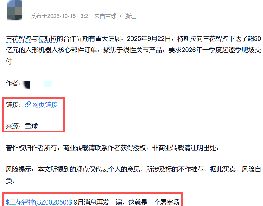 10月15日上午,ID为@tslaming的个人账号发帖称,“国内媒体报道称,特斯拉已向三花智控下达价值6.85亿美元(约合50亿元人民币)的大额订单,采购Optimus线性执行器,首批交付计划于2026年第一季度启动。”